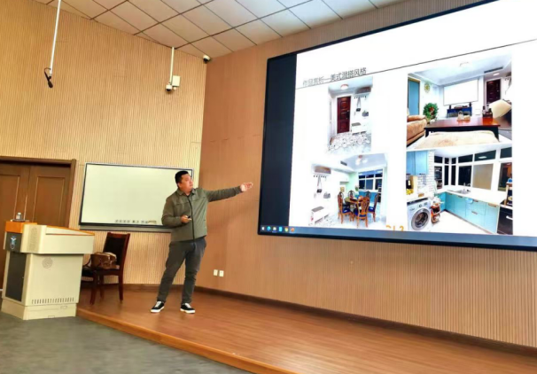 姜华校友首先用数据给同学们分析了房地产以及室内设计近几年的发展走向。通过房地产与室内设计领域近五年的市场规模、岗位需求、技术革新等客观数据为切入点,揭示行业数字化转型、绿色设计理念普及、用户个性化需求升级等趋势。一方面通过案例解析帮助学生建立职业认知框架,理解设计价值实现路径;另一方面以行业痛点为驱动设置专业研究,如适老化空间改造、智慧家居交互设计等,引导学生在定义问题、调研需求、设计构思的全流程中,构建系统性解决复杂现实问题的能力框架。