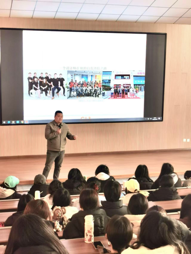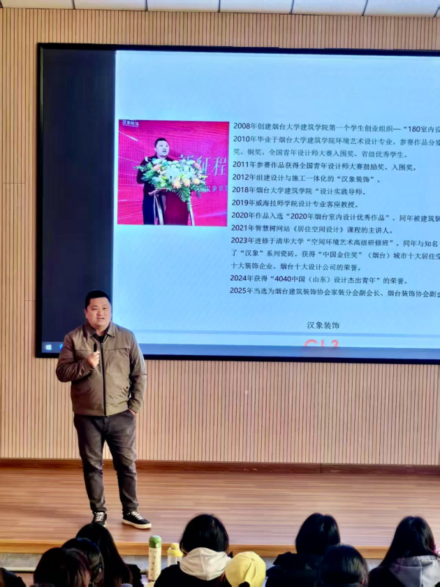 06级优秀校友——烟台汉象装饰工程有限公司总经理姜华走进课堂,为环境设计专业建243-1、2班学生开展了一堂题为《一个设计师在地的自我进阶之路》的讲座。此次活动旨在打破传统教育壁垒,搭建校企深度对话平台,通过行业专家进课堂的形式,推动环境设计教育与产业发展同频共振,探索产教融合创新路径。
