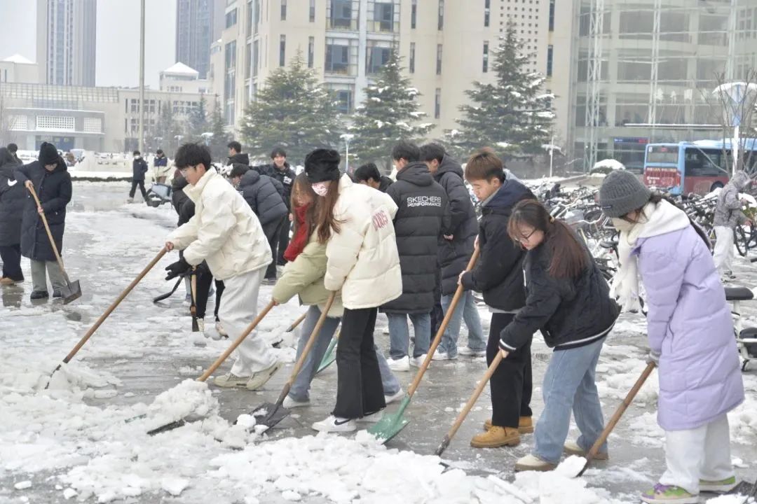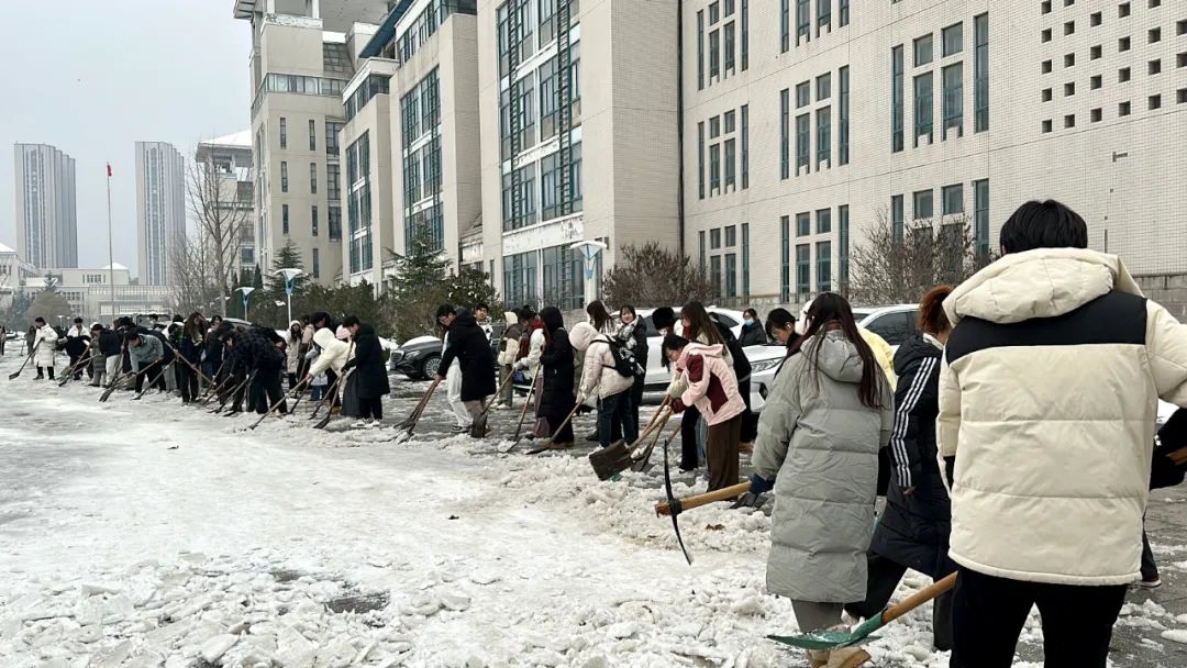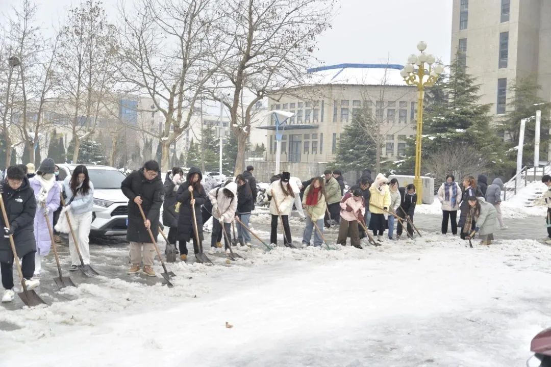 在路面积雪后的第一时间,学院迅速组织部署,落实扫雪除冰工作,确保人员、装备、物资全部到位,组织党支部、团支部投入到扫雪的行列中,青年学生志愿者和学院党员教师也积极出动,迅速开展积雪清扫工作。