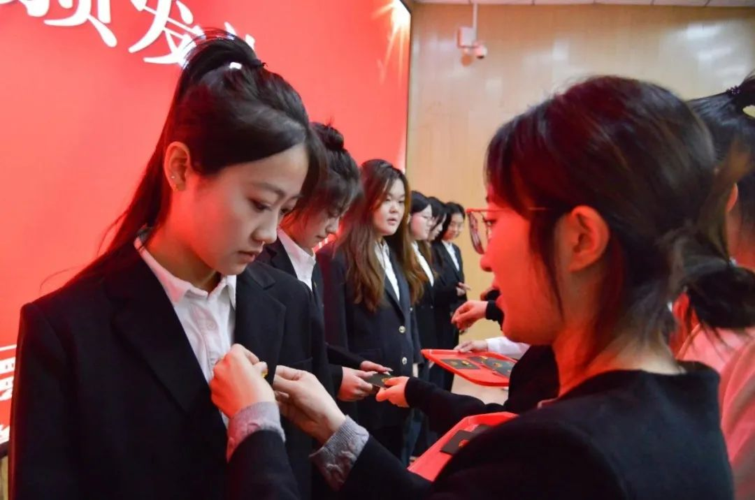 学院团委老师为新团员佩戴团徽、颁发团员证